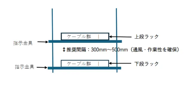ケーブルラックは、電線の種類・本数・重量に応じて、支持間隔・積載荷重・通風性を考慮して設置すること。 - 第3102-3項(多段設置)