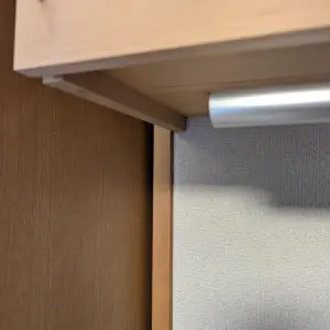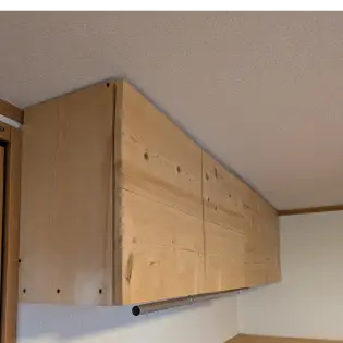 底板はサイズをそのまま活かし、扉は 1×10 の板をダボでつないで四等分し、ふたとして利用しています。棚の底面にはハンガーを掛けられるパイプを取り付け、収納と衣類掛けを兼ね備えた多機能仕様にしました。