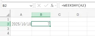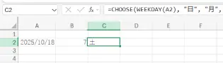 → A2に「2025/10/18」が入っていれば、「7」(土曜日)と表示されます。
