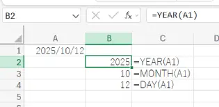 同様に、B3セルには =MONTH(A1)、B4セルには =DAY(A1) を使って、A1の日付からそれぞれ「月」と「日」の部分を抽出しています。
