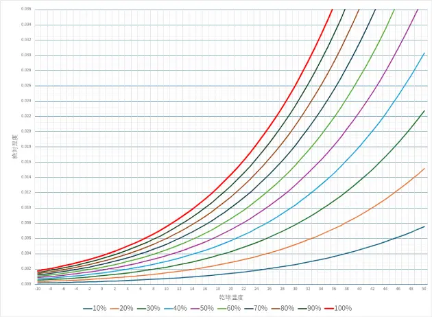 湿度曲線(10〜100%)は、空気線図の湿度曲線そのもの